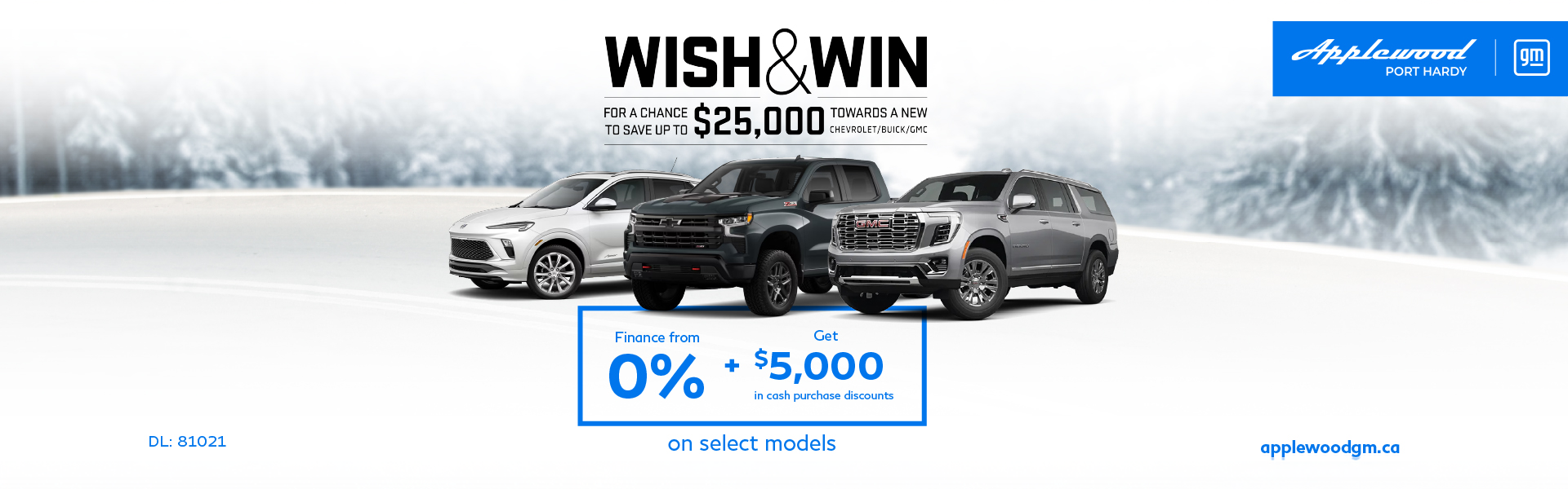 IN CASH PURCHASE DISCOUNTS + WISH AND WIN UP TO $25,000 TOWARDS THE PURCHASE OF A NEW CHEVROLET/BUICK/GMC VEHICLE
